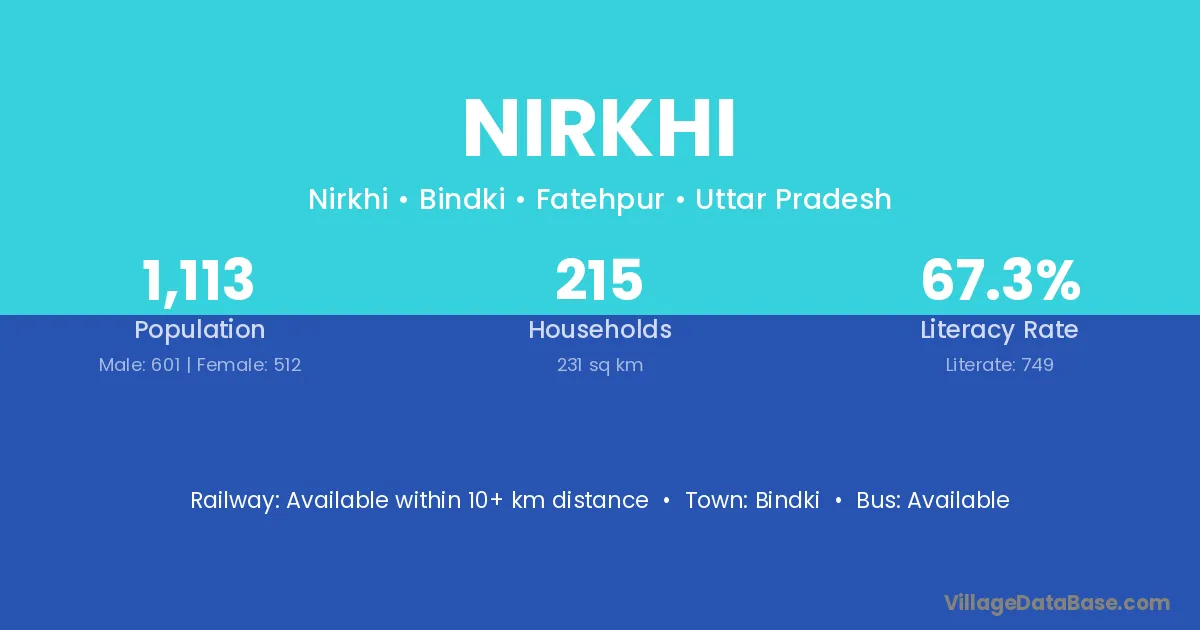 Nirkhi village has a total population of 1,113 people, of which 601 are males and 512 are females.