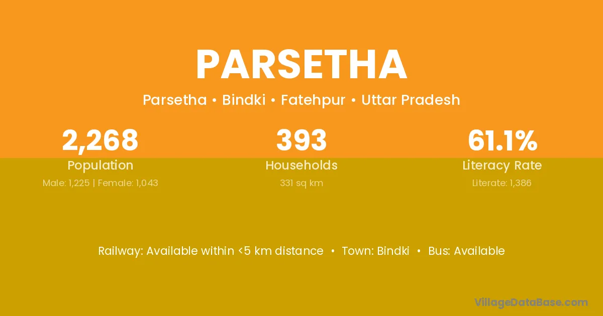 Parsetha village has a total population of 2,268 people, of which 1,225 are males and 1,043 are females.
