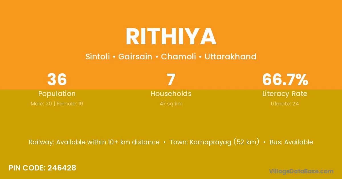The literacy rate of Rithiya village is 51.21%. Male literacy stands at 59.36% and female literacy at 42.49%.