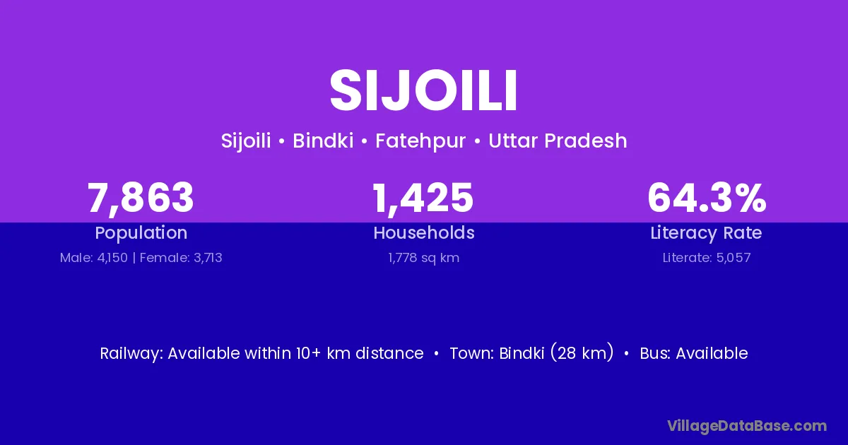 Sijoili village has a total population of 7,863 people, of which 4,150 are males and 3,713 are females.