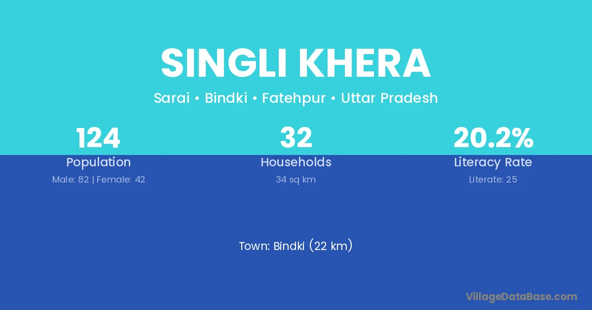 Bindki (22 km) is the nearest town to Singli Khera village for major economic activities and is located approximately 22 km away.