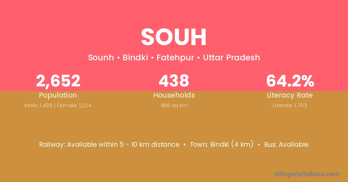 Bindki (4 km) is the nearest town to Souh village for major economic activities and is located approximately 4 km away.
