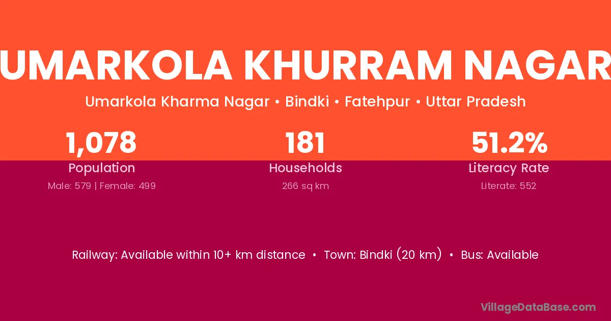 Bindki (20 km) is the nearest town to Umarkola Khurram Nagar village for major economic activities and is located approximately 20 km away.
