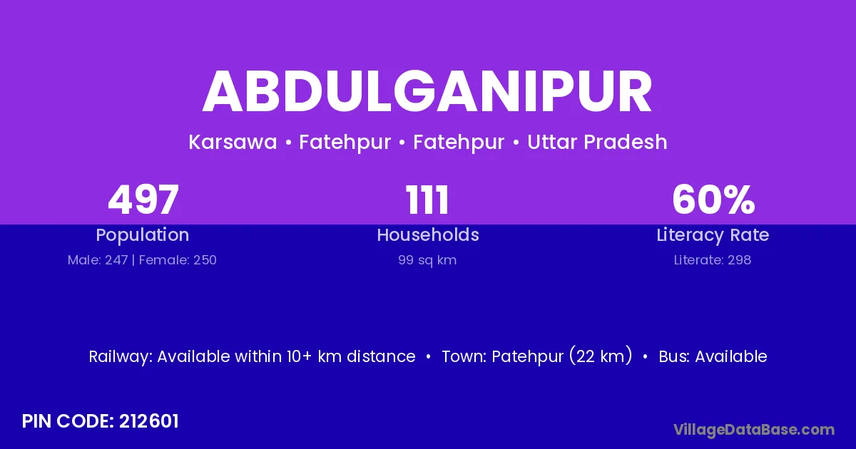 Patehpur (22 km) is the nearest town to Abdulganipur village for major economic activities and is located approximately 22 km away.