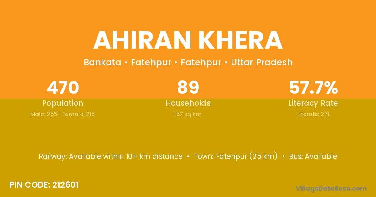 Fatehpur (25 km) is the nearest town to Ahiran Khera village for major economic activities and is located approximately 25 km away.