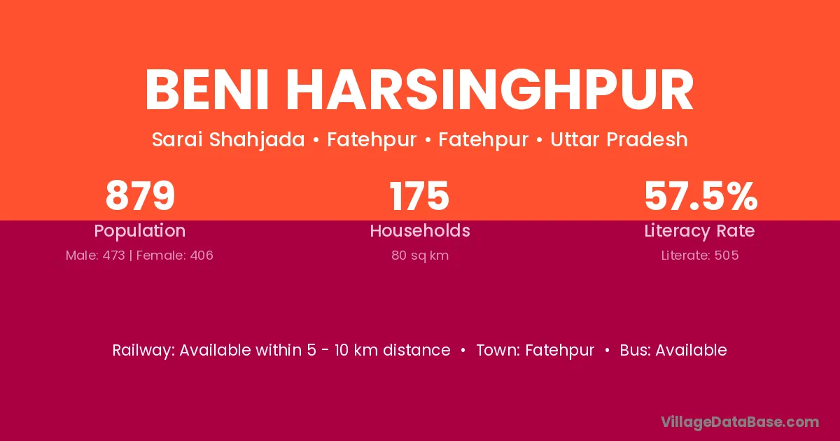 Beni Harsinghpur village has a total population of 879 people, of which 473 are males and 406 are females.