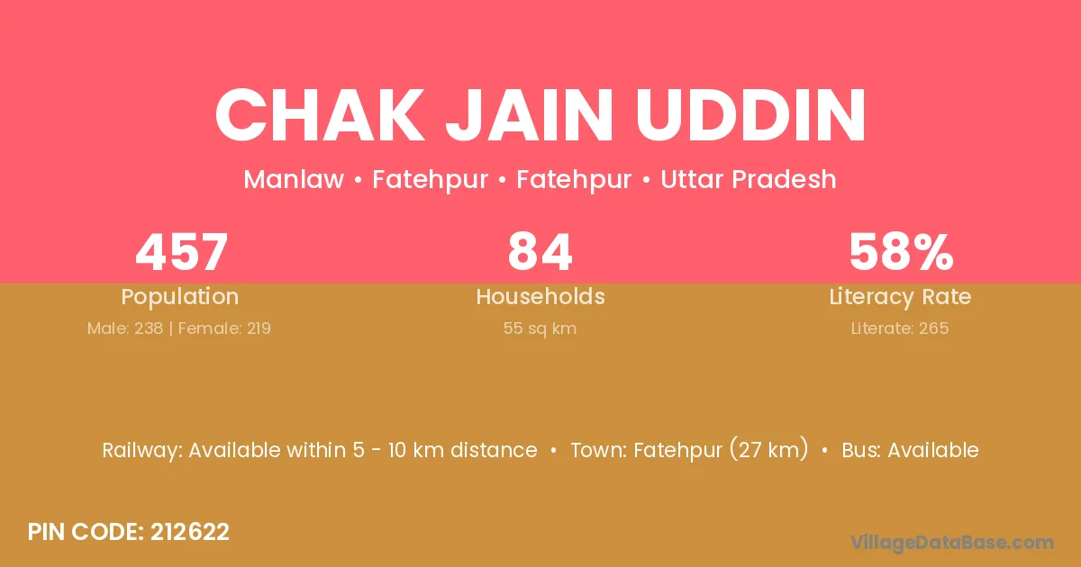 Fatehpur (27 km) is the nearest town to Chak Jain Uddin village for major economic activities and is located approximately 27 km away.