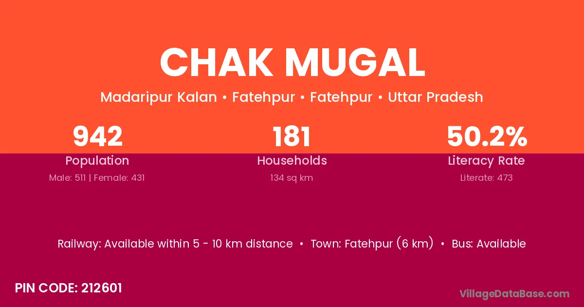 Fatehpur (6 km) is the nearest town to Chak Mugal village for major economic activities and is located approximately 6 km away.