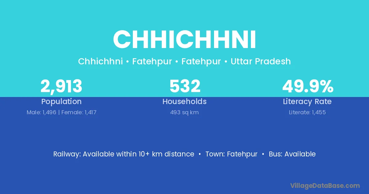 Chhichhni village has a total population of 2,913 people, of which 1,496 are males and 1,417 are females.