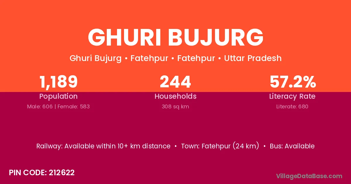 Fatehpur (24 km) is the nearest town to Ghuri Bujurg village for major economic activities and is located approximately 24 km away.