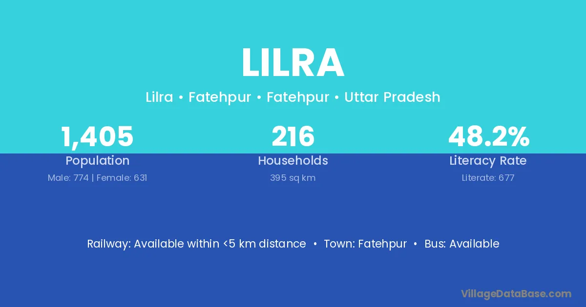 Lilra village has a total population of 1,405 people, of which 774 are males and 631 are females.