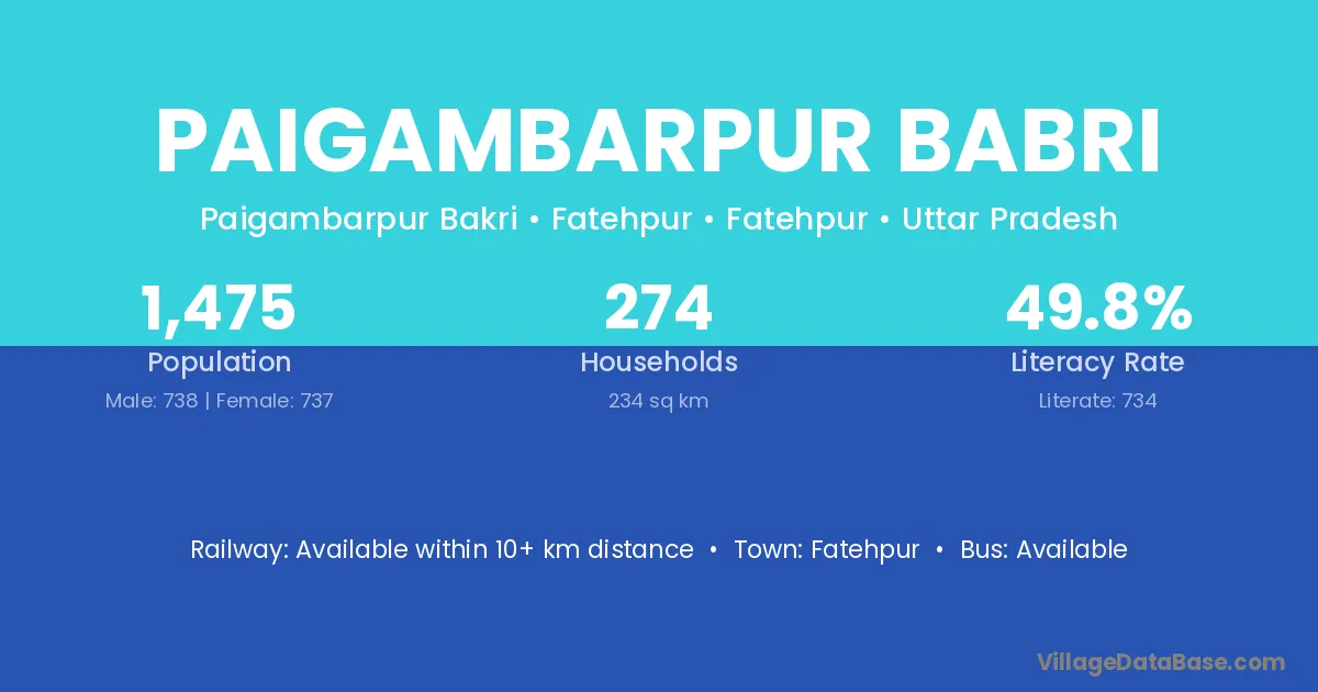 Paigambarpur Babri village has a total population of 1,475 people, of which 738 are males and 737 are females.
