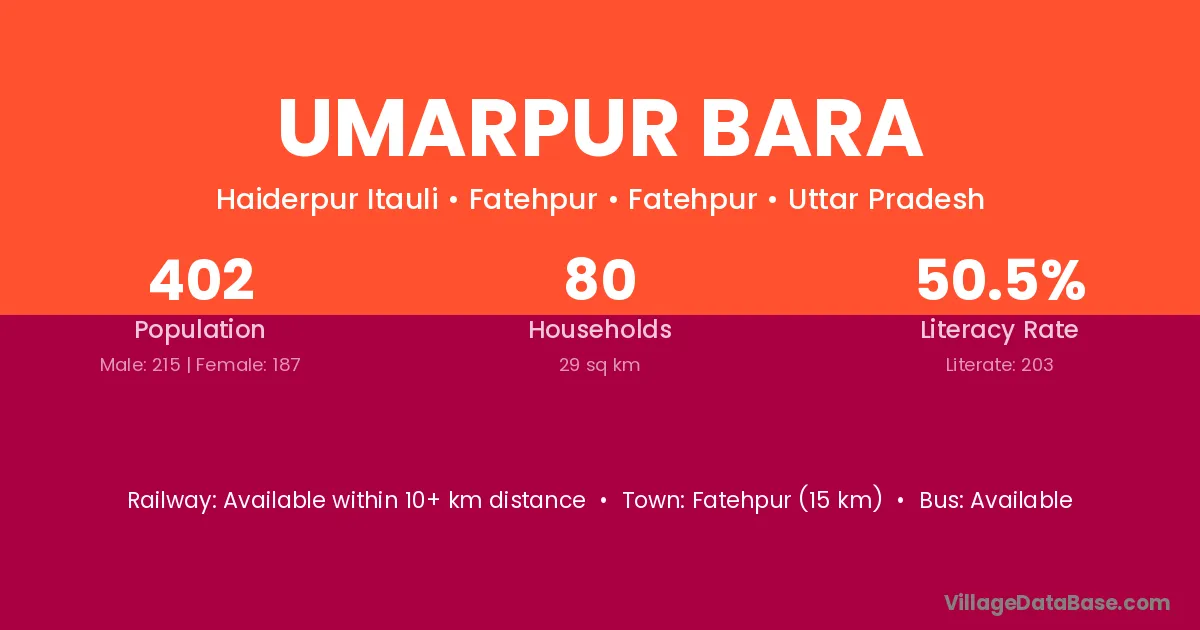 Fatehpur (15 km) is the nearest town to Umarpur Bara village for major economic activities and is located approximately 15 km away.