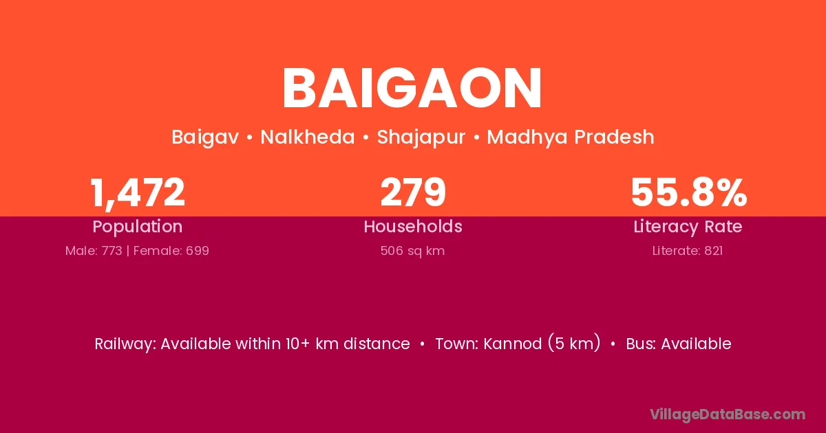 Baigaon village has a total population of 4,848 people, of which 2,478 are males and 2,370 are females.