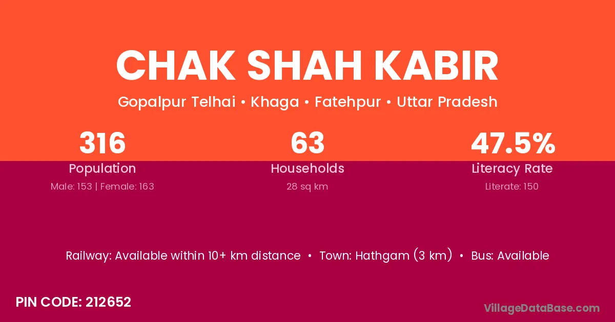 Hathgam (3 km) is the nearest town to Chak Shah Kabir village for major economic activities and is located approximately 3 km away.