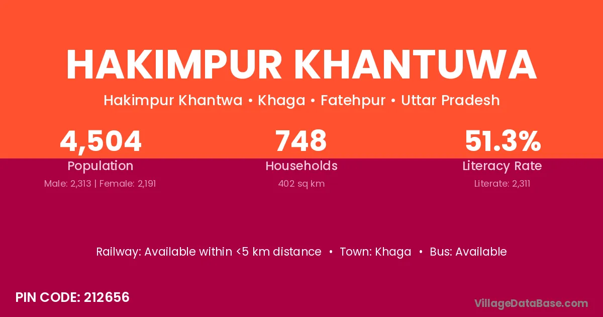 Hakimpur Khantuwa village has a total population of 4,504 people, of which 2,313 are males and 2,191 are females.