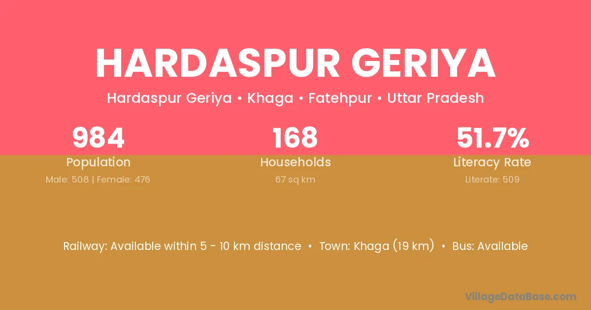 Khaga (19 km) is the nearest town to Hardaspur Geriya village for major economic activities and is located approximately 19 km away.