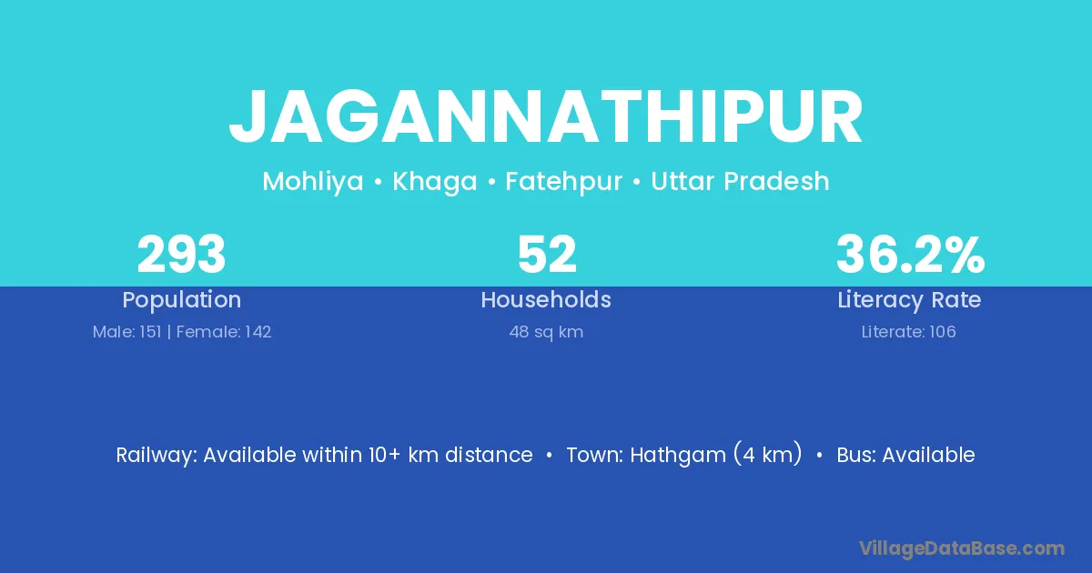 Jagannathipur village has a total population of 293 people, of which 151 are males and 142 are females.