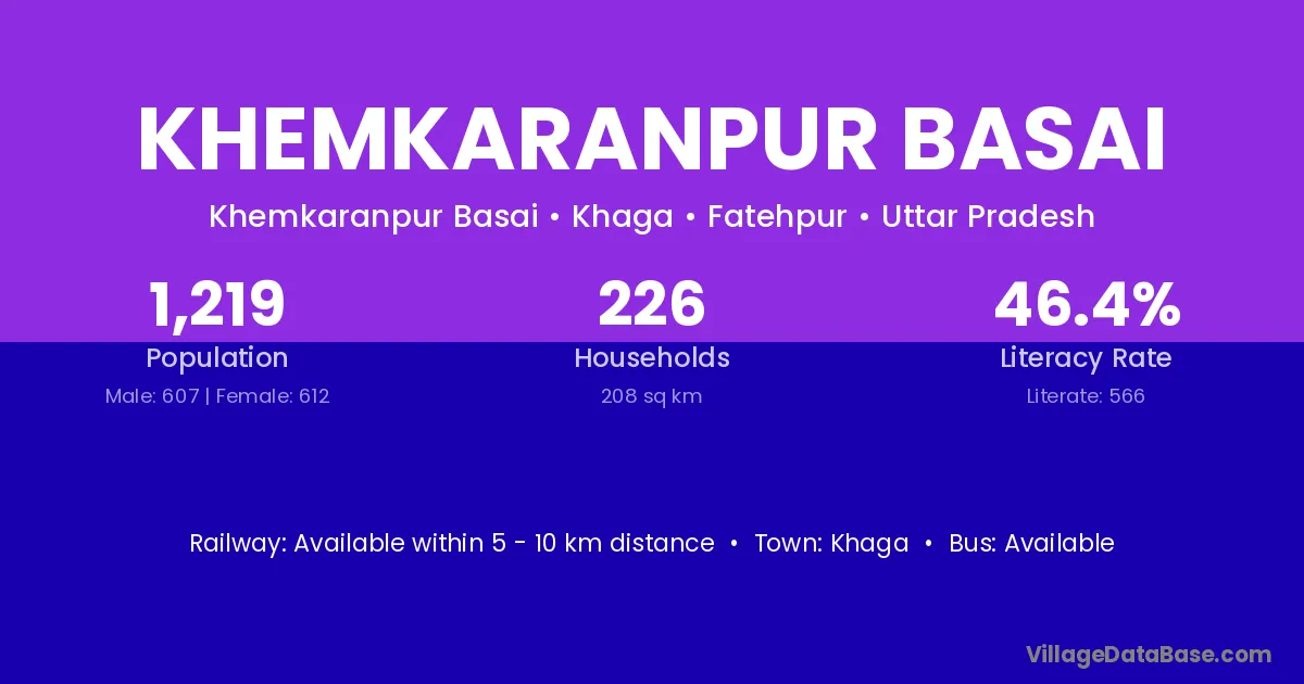 Khemkaranpur Basai village has a total population of 1,219 people, of which 607 are males and 612 are females.