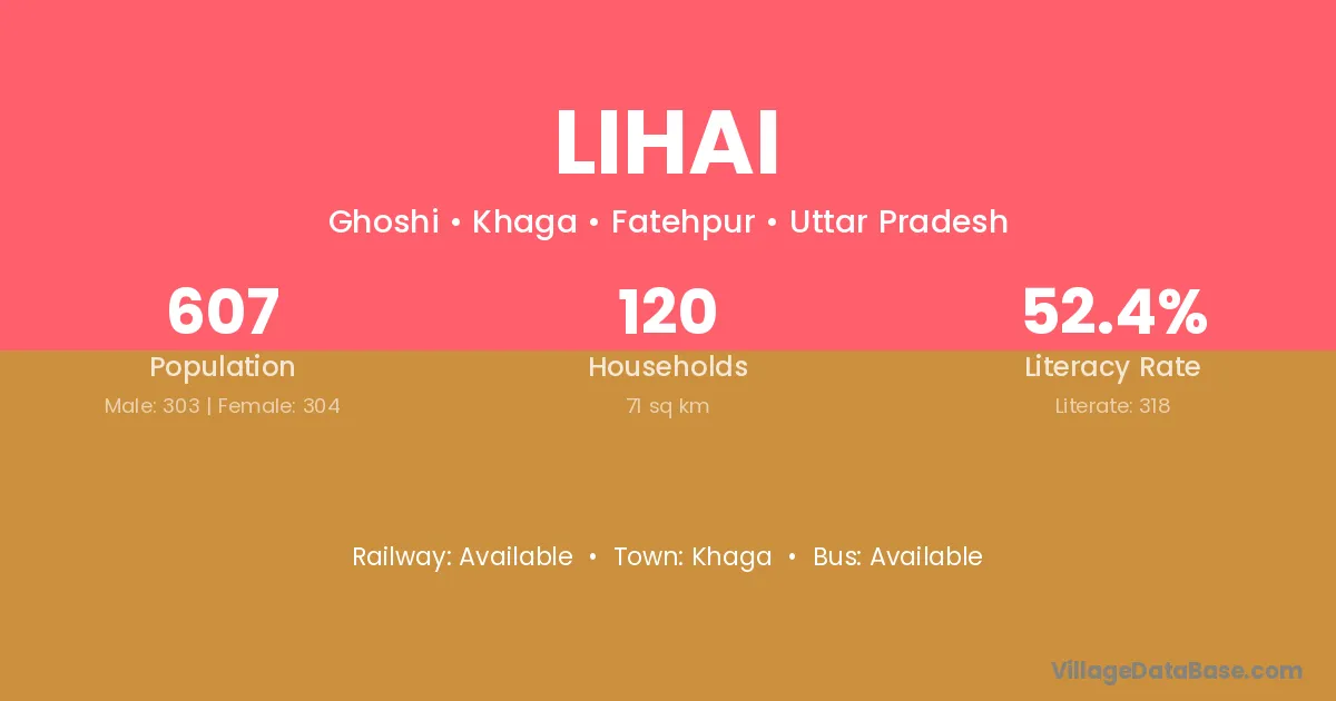 Lihai village has a total population of 607 people, of which 303 are males and 304 are females.