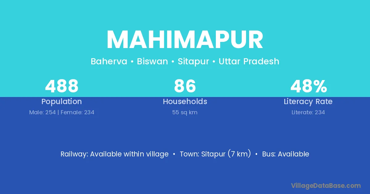 The literacy rate of Mahimapur village is 62.78%. Male literacy stands at 73.26% and female literacy at 51.18%.