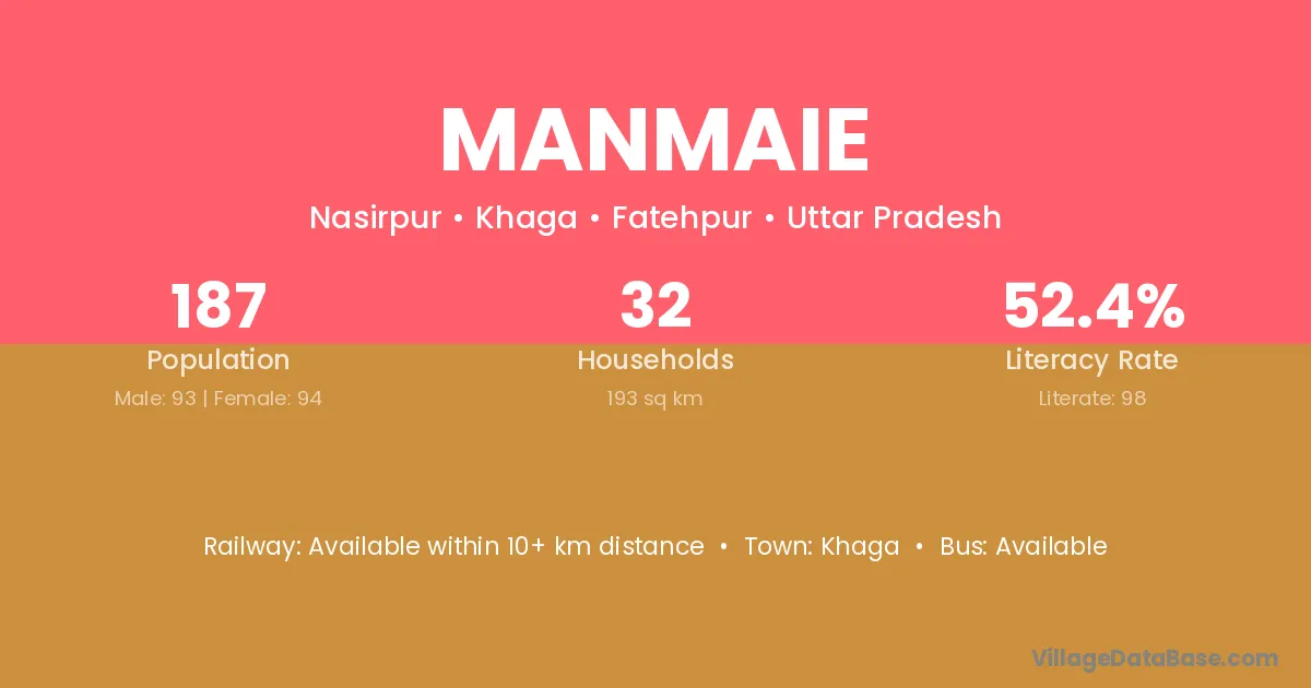 Manmaie village has a total population of 187 people, of which 93 are males and 94 are females.