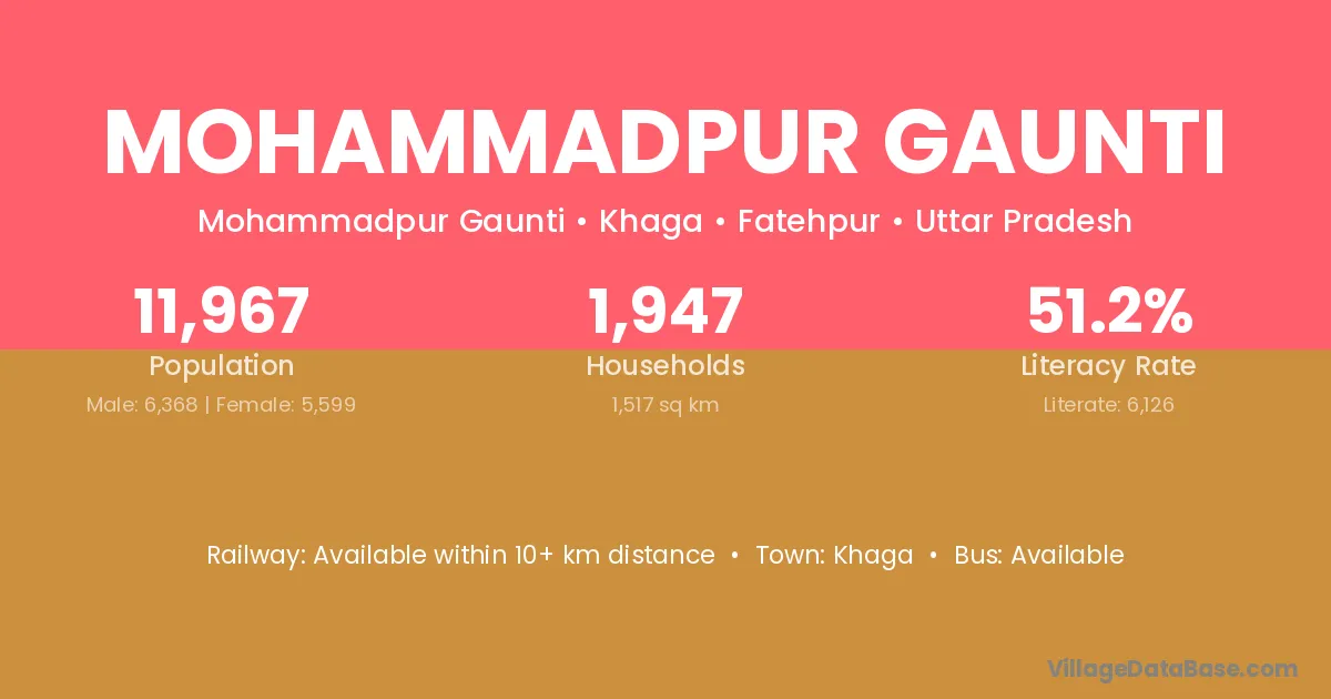 Mohammadpur Gaunti village has a total population of 11,967 people, of which 6,368 are males and 5,599 are females.