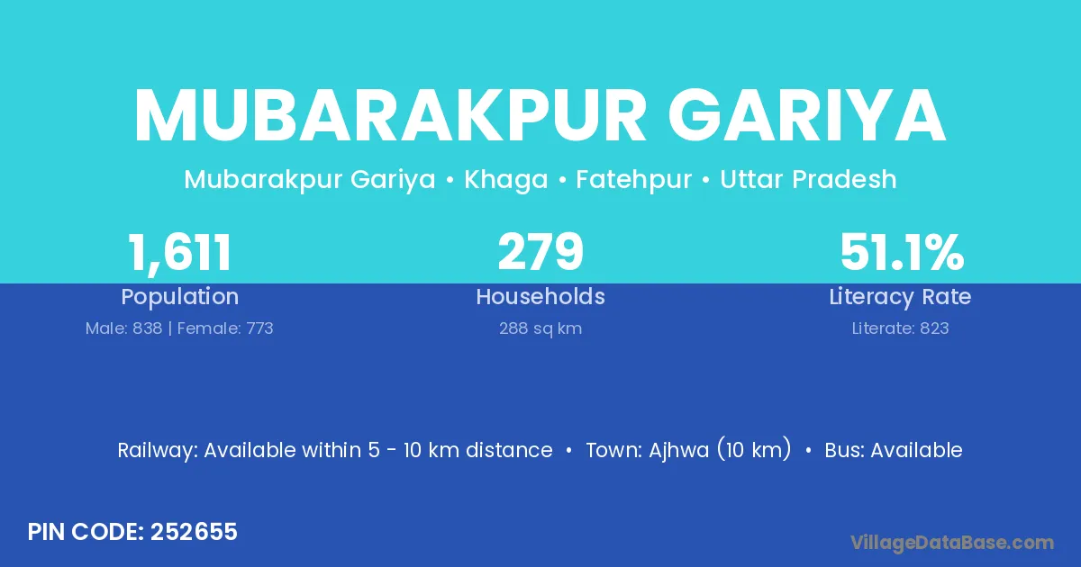 Mubarakpur Gariya village has a total population of 1,611 people, of which 838 are males and 773 are females.