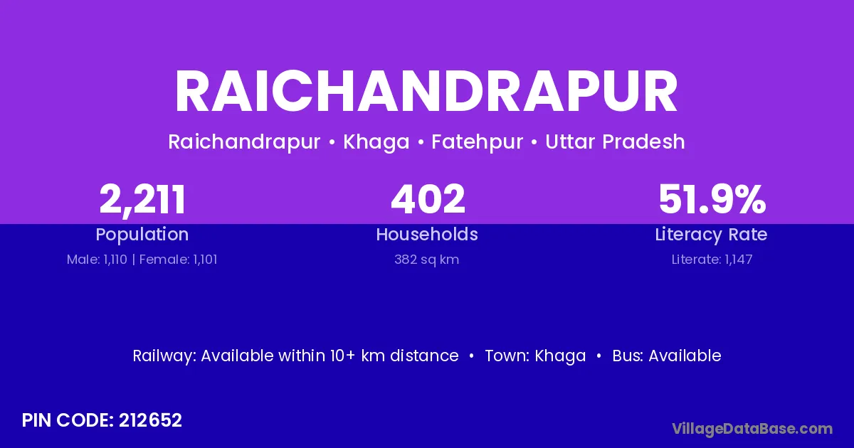 Raichandrapur village has a total population of 2,211 people, of which 1,110 are males and 1,101 are females.
