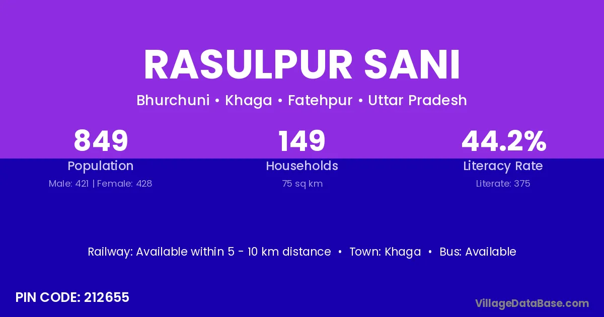 Rasulpur Sani village has a total population of 849 people, of which 421 are males and 428 are females.