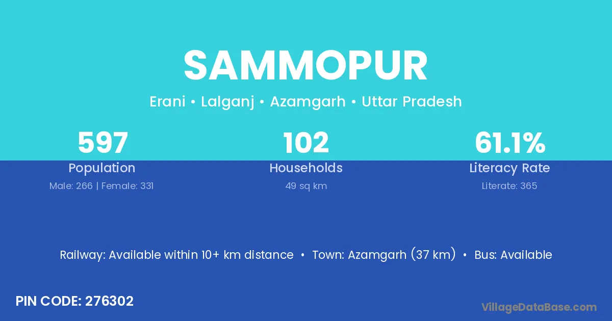 The literacy rate of Sammopur village is 37.05%. Male literacy stands at 45.82% and female literacy at 26.43%.