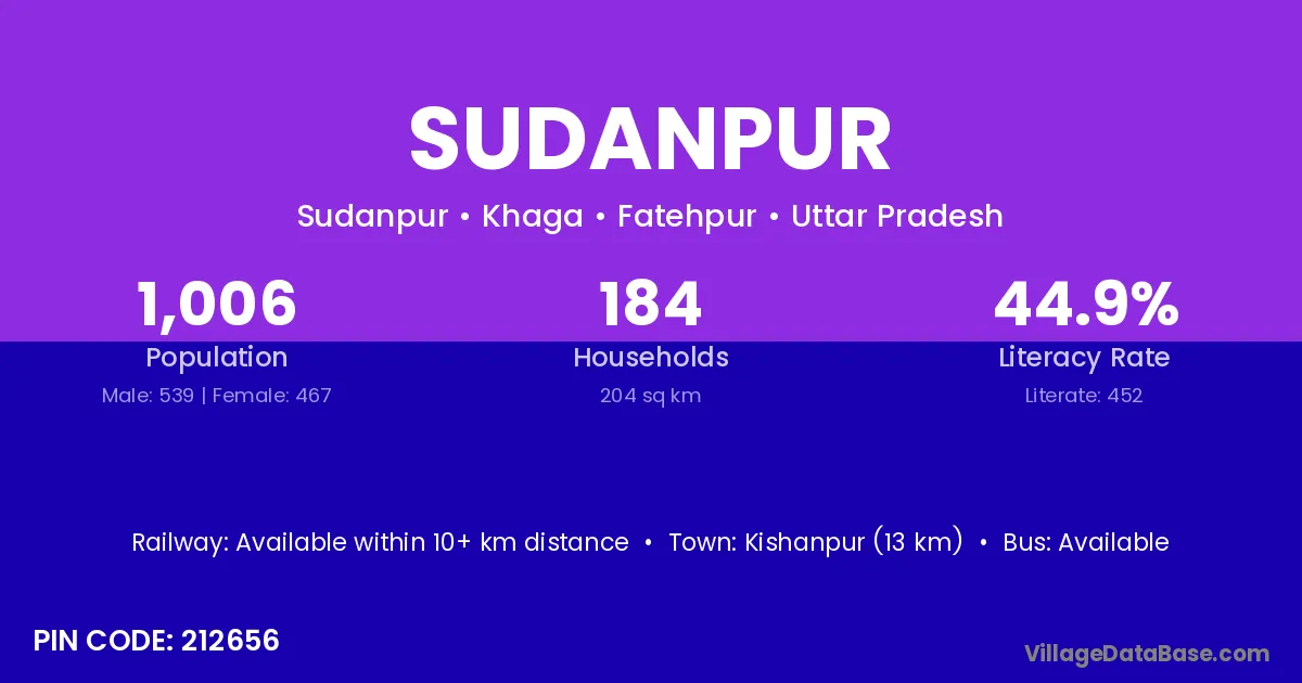 Kishanpur (13 km) is the nearest town to Sudanpur village for major economic activities and is located approximately 13 km away.