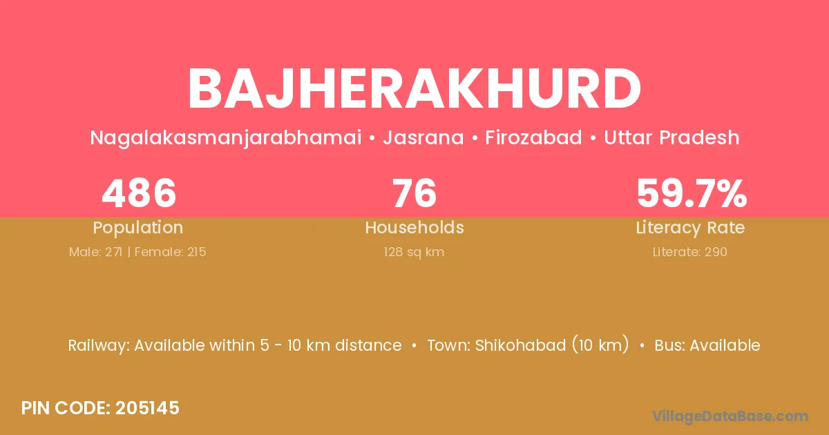 Shikohabad (10 km) is the nearest town to Bajherakhurd village for major economic activities and is located approximately 10 km away.