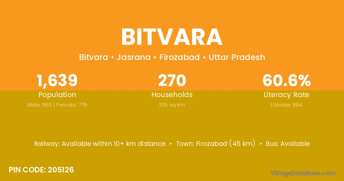 Firozabad (45 km) is the nearest town to Bitvara village for major economic activities and is located approximately 45 km away.