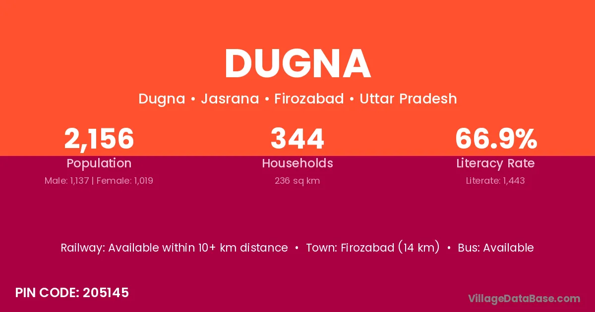 Firozabad (14 km) is the nearest town to Dugna village for major economic activities and is located approximately 14 km away.