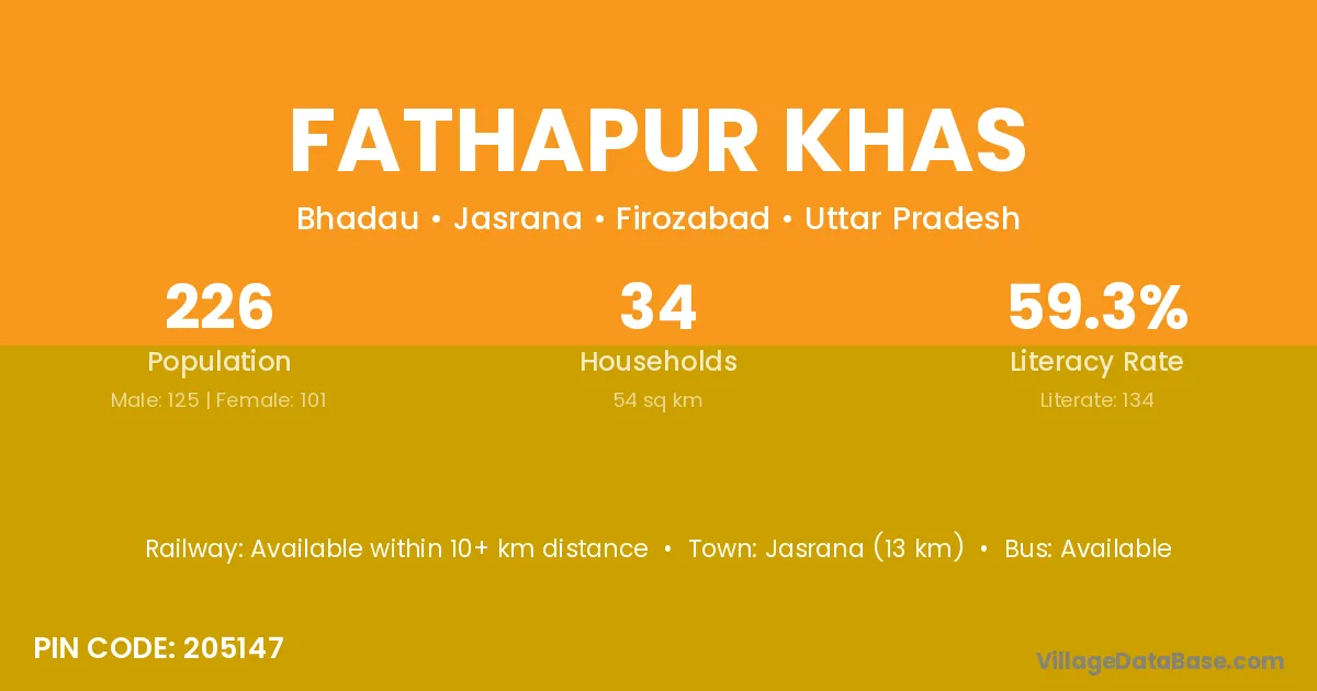 Jasrana (13 km) is the nearest town to Fathapur Khas village for major economic activities and is located approximately 13 km away.