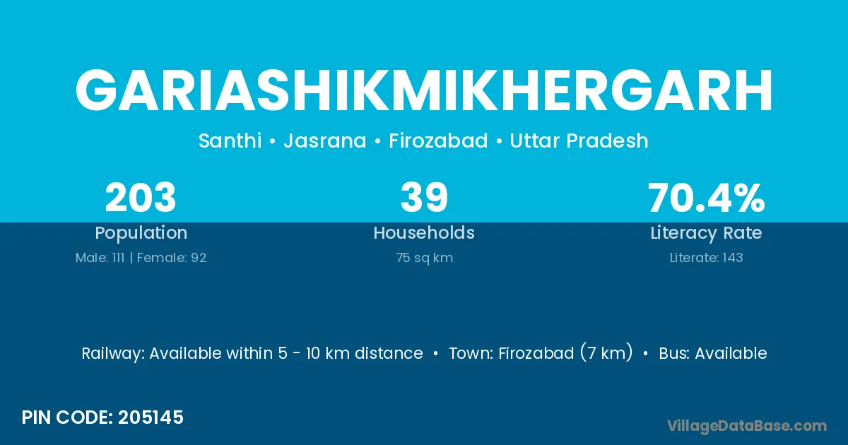 Firozabad (7 km) is the nearest town to Gariashikmikhergarh village for major economic activities and is located approximately 7 km away.