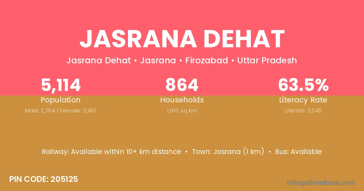 Jasrana Dehat village has a total population of 5,114 people, of which 2,704 are males and 2,410 are females.