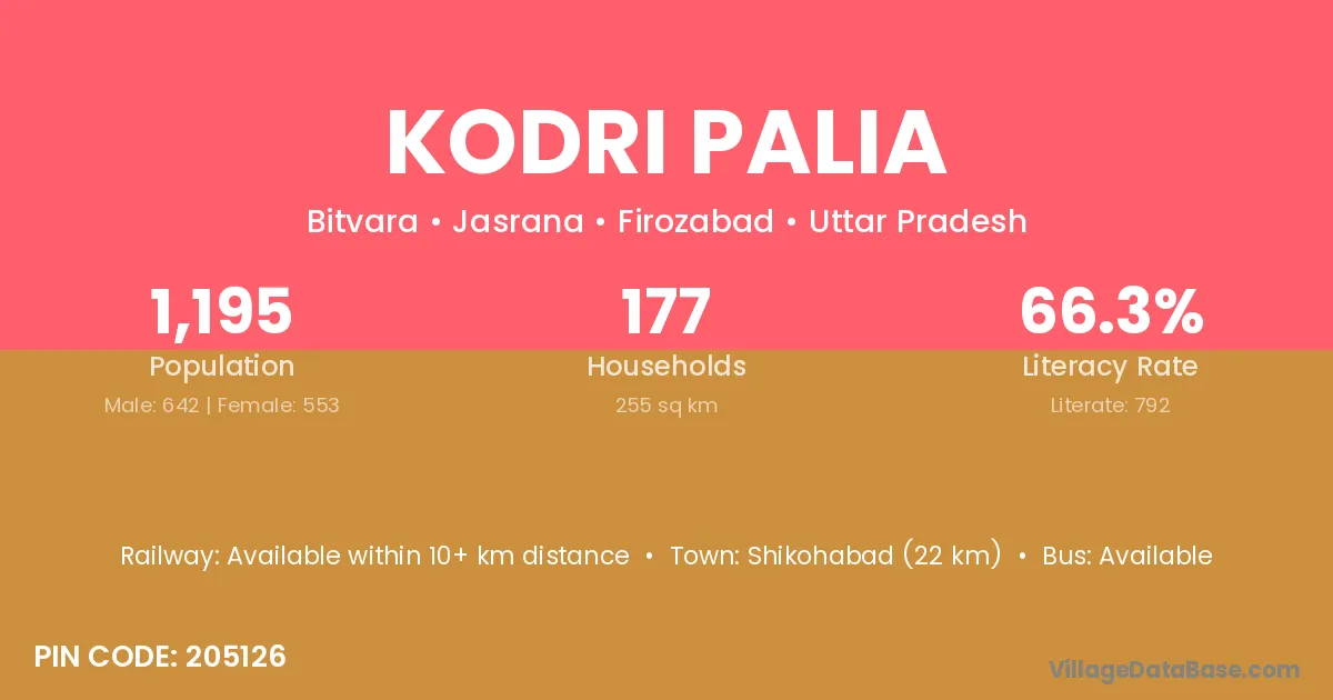 Shikohabad (22 km) is the nearest town to Kodri Palia village for major economic activities and is located approximately 22 km away.