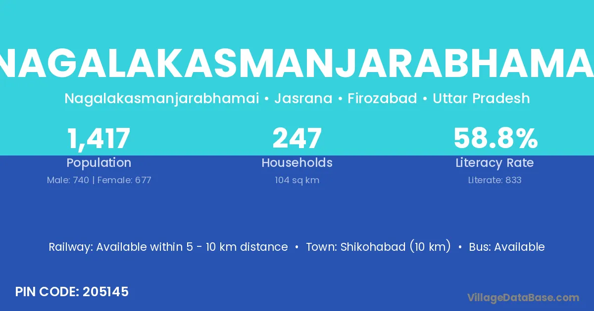 Shikohabad (10 km) is the nearest town to Nagalakasmanjarabhamai village for major economic activities and is located approximately 10 km away.