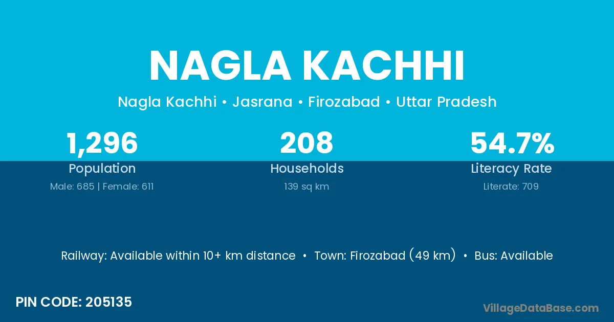 Firozabad (49 km) is the nearest town to Nagla Kachhi village for major economic activities and is located approximately 49 km away.
