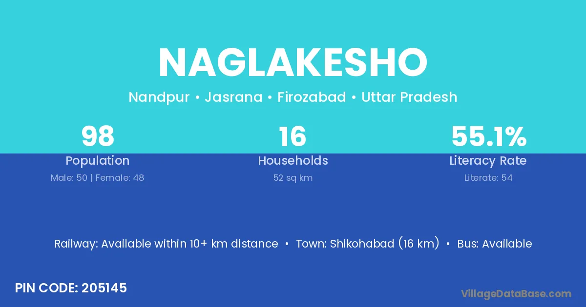 Shikohabad (16 km) is the nearest town to Naglakesho village for major economic activities and is located approximately 16 km away.