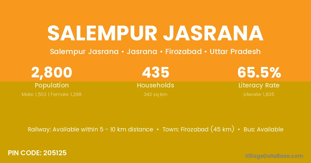 Firozabad (45 km) is the nearest town to Salempur Jasrana village for major economic activities and is located approximately 45 km away.
