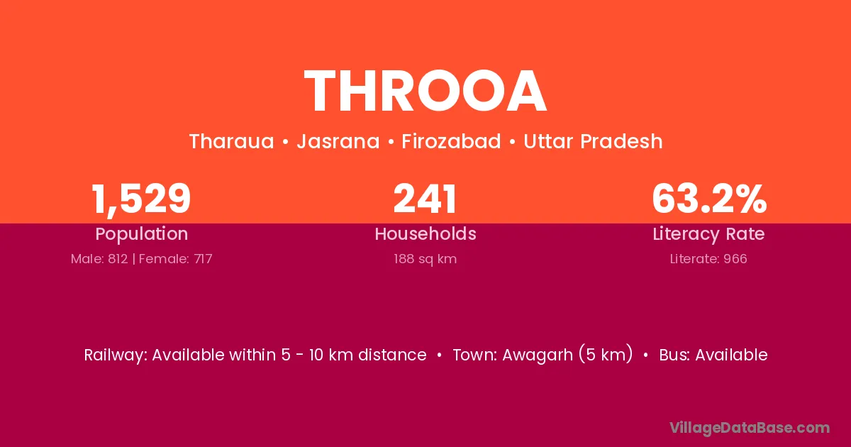 Awagarh (5 km) is the nearest town to Throoa village for major economic activities and is located approximately 5 km away.