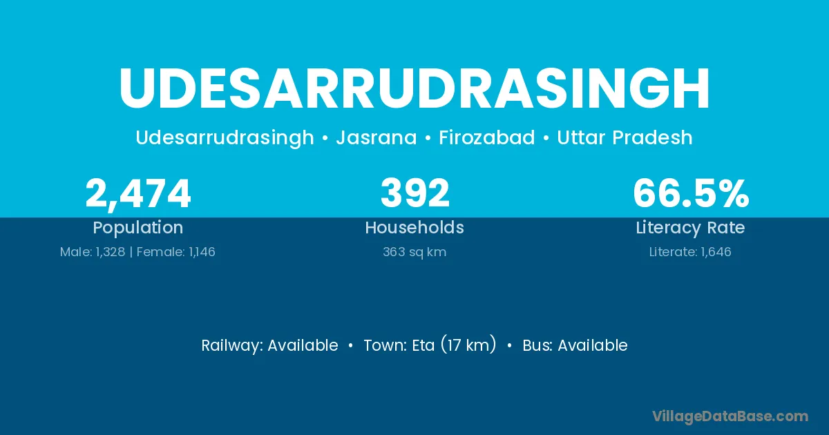 Eta (17 km) is the nearest town to Udesarrudrasingh village for major economic activities and is located approximately 17 km away.
