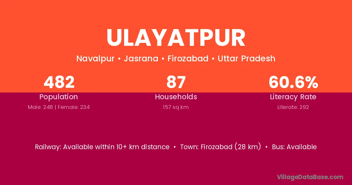 Firozabad (28 km) is the nearest town to Ulayatpur village for major economic activities and is located approximately 28 km away.