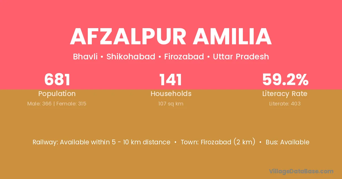 Firozabad (2 km) is the nearest town to Afzalpur Amilia village for major economic activities and is located approximately 2 km away.