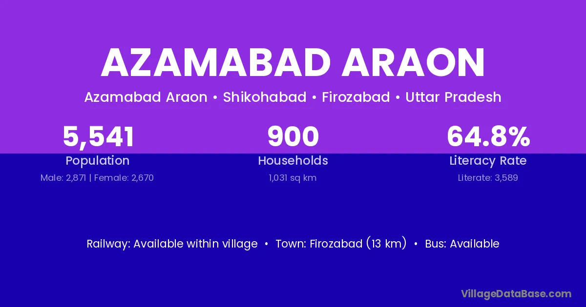 Firozabad (13 km) is the nearest town to Azamabad Araon village for major economic activities and is located approximately 13 km away.