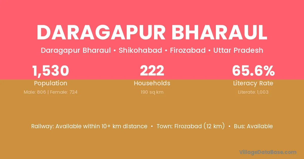 Firozabad (12 km) is the nearest town to Daragapur Bharaul village for major economic activities and is located approximately 12 km away.
