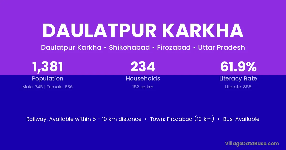 Firozabad (10 km) is the nearest town to Daulatpur Karkha village for major economic activities and is located approximately 10 km away.